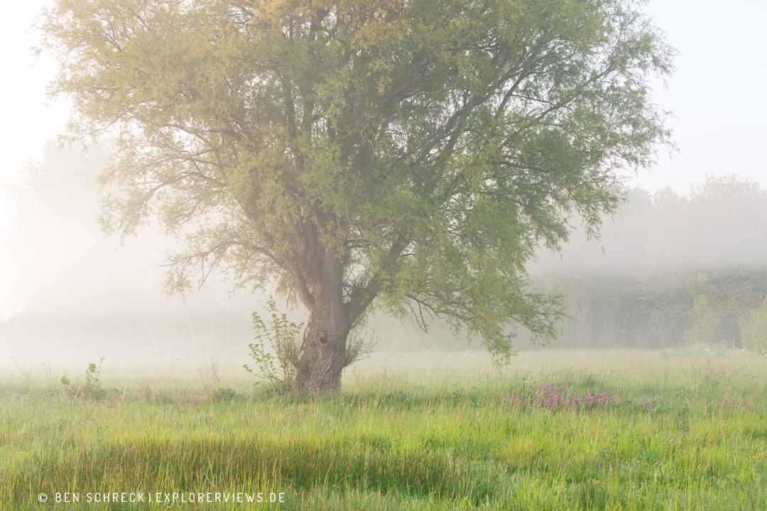 Dieses Foto vom Baum im Morgennebel entstand in den Sümpfen Marais du Cotentin et du Bessin, ein Naturpark in der Normandie. Es ist eine Weide, die dort in den Feuchtwiesen zu einer beachtlichen Größe herangewachsen ist. Ein paar Blümchen spitzen aus der Wiese um den Baum. Der Nebel gab der Landschaft einen diffuses Aussehen. Es war an einem schönen Frühlingstag.