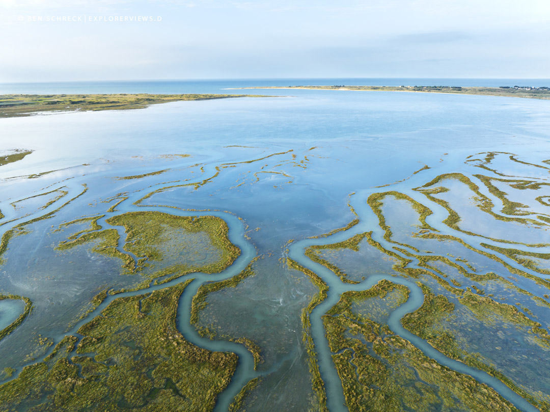 Das Foto entstand bei einem Überflug über die Salzwiesen an der Westseite der Normandie auf der Halbinsel Cotentin. Es zeigt die Salzwiesen, wie sie gerade vom Meer bei Flut unter Wasser stehen. Entlang dieser Küste hat die Natur große Einbuchtungen geschaffen, die wir heute Havre, Hafen nennen. Diese natürlichen Häfen sind wunderbare Orte für Tiere und Pflanzen.