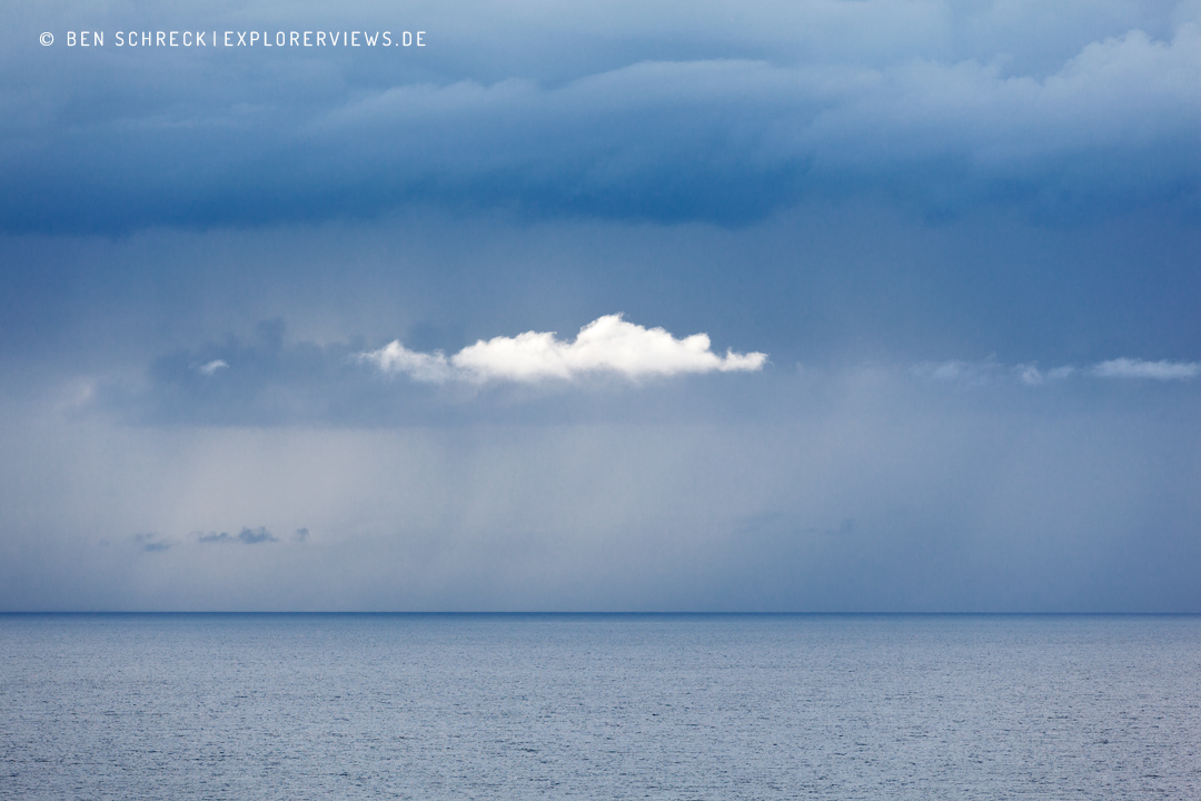 Puristische Naturfotos von Meer und Wolken konnte ich immer wieder einfangen. Bilder von Wasser in unterschiedlichem Aggregatzustand, flüssig – Meer und flüssig, gasförmig, gefroren – Wolken.