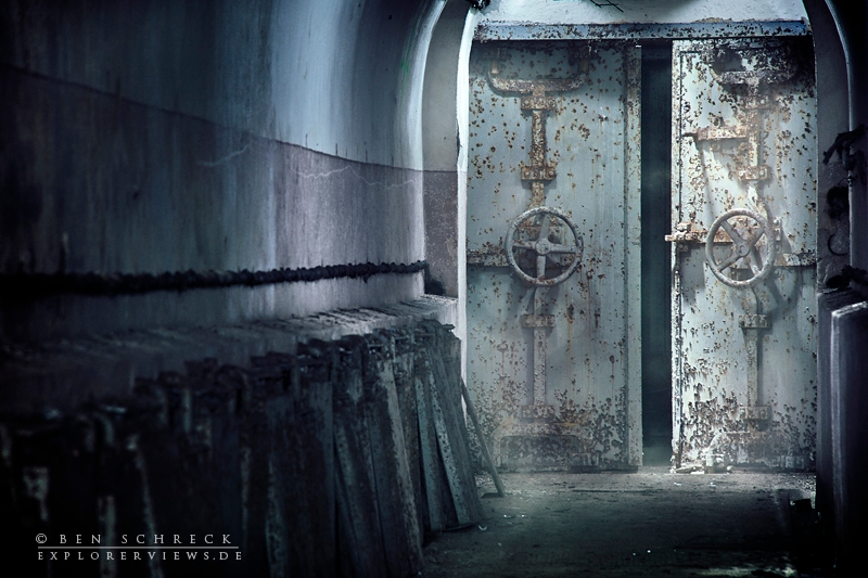 Bei Gängen muß man etwas kreativer sein. Wie zum Beispiel auf dem Bild rechts, ein Blick in einen Bunker. Hier wurde eine Benzinlampe mit warmem Licht mitten im Gang platziert. Eine LED Lampe leuchtet vom Ende des Tunnels in Richtung Kamera und der Vordergrund wurde ebenfalls mit einer kalten LED Lampe ausgeleuchtet. Es entsteht ein Bild mit verschieden farbigen Lichtern, das doch noch einigermaßen stimmig ist, oder?