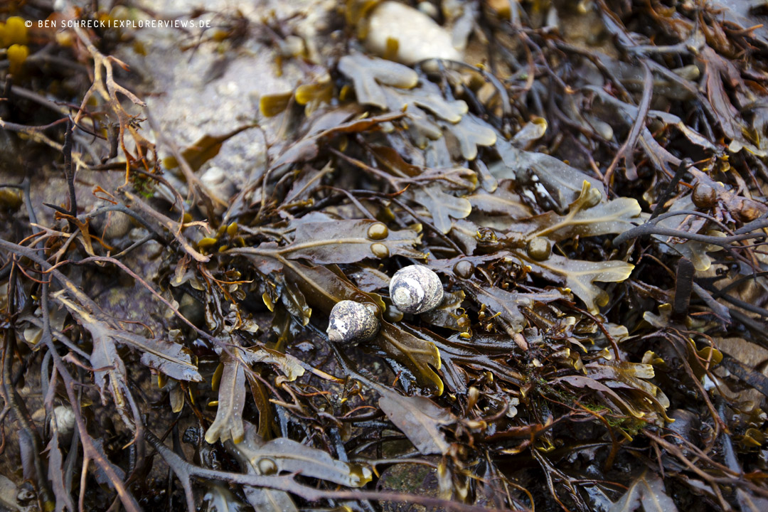 Bei einem Spaziergang an der Küste stößt man manchmal auf die Schönheit des Meeres. Für mich sind das vor allem die kleinen Details, die man am Strand und zwischen den Felsen an der Küste finden kann. Wie hier auf dem Foto zwei Schnecken auf Blasenalgen, die bei Ebbe über den rutschigen Untergrund zwischen Land und Meer kriechen.