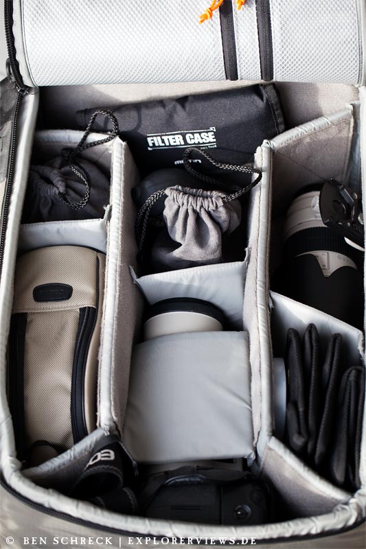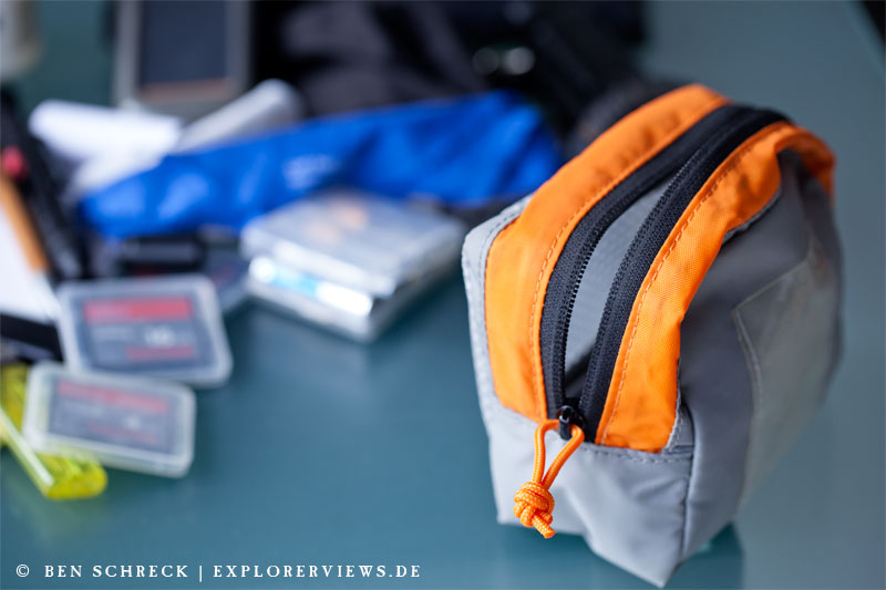 Insgesamt sind es zwar viele Utensilien, aber alle sehr klein und leicht und passen in die Innentaschen der Kameraaufbewahrung. Die meisten Helferlein in meiner Liste sind in der kleinen Tasche mit Reisverschluss untergebracht, die ich auch bequem in einem anderen Fotorucksack oder Kameratasche verstauen kann. So sind die Basics immer zusammen und dabei.