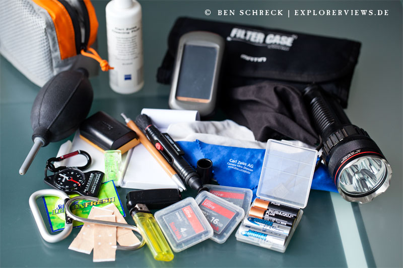 Die folgende Liste zeigt die wichtigsten Dinge in meiner Fototasche. Sie sind klein, nicht schwer, praktisch, hiflreich und teilweise sogar essentiell.