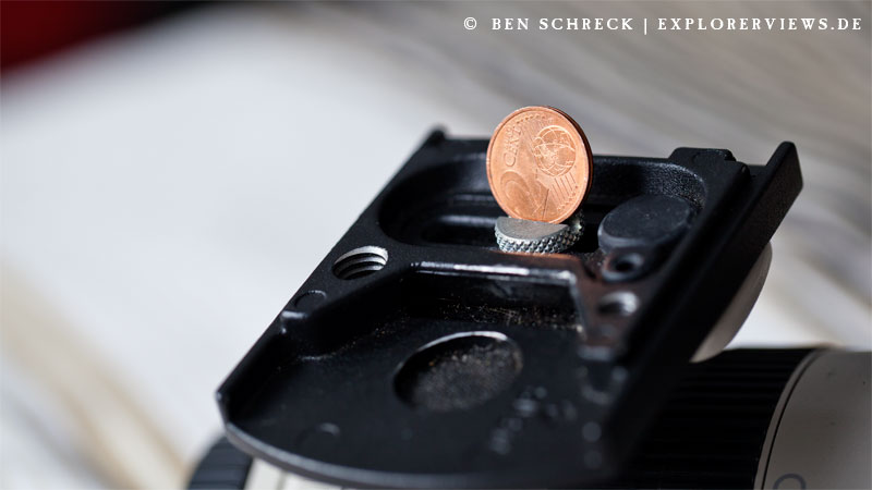 Warum ein 2 Cent Stück? Ganz einfach, weil man damit die Stativplattenschraube ziemlich einfach festziehen und losschrauben kann. Und wer eine Stativplatte dabei hat, hat auch ein Stativ dabei! Manchmal habe ich ein kleines Ministativ im Rucksack und das große Stativ schleppe ich so mit mir herum.